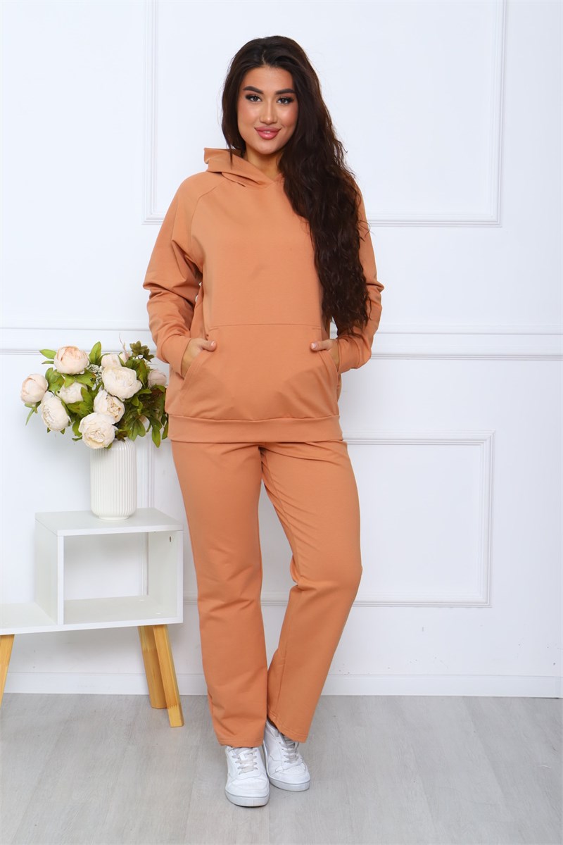 Костюм женский, выполнен из трикотажного полотна футер 2-х нитка. Костюм состоит из кофты и брюк. Кофта свободного кроя с капюшоном, рукава на манжетах, на полочке карман кенгуру. Брюки прямого кроя, с карманами.