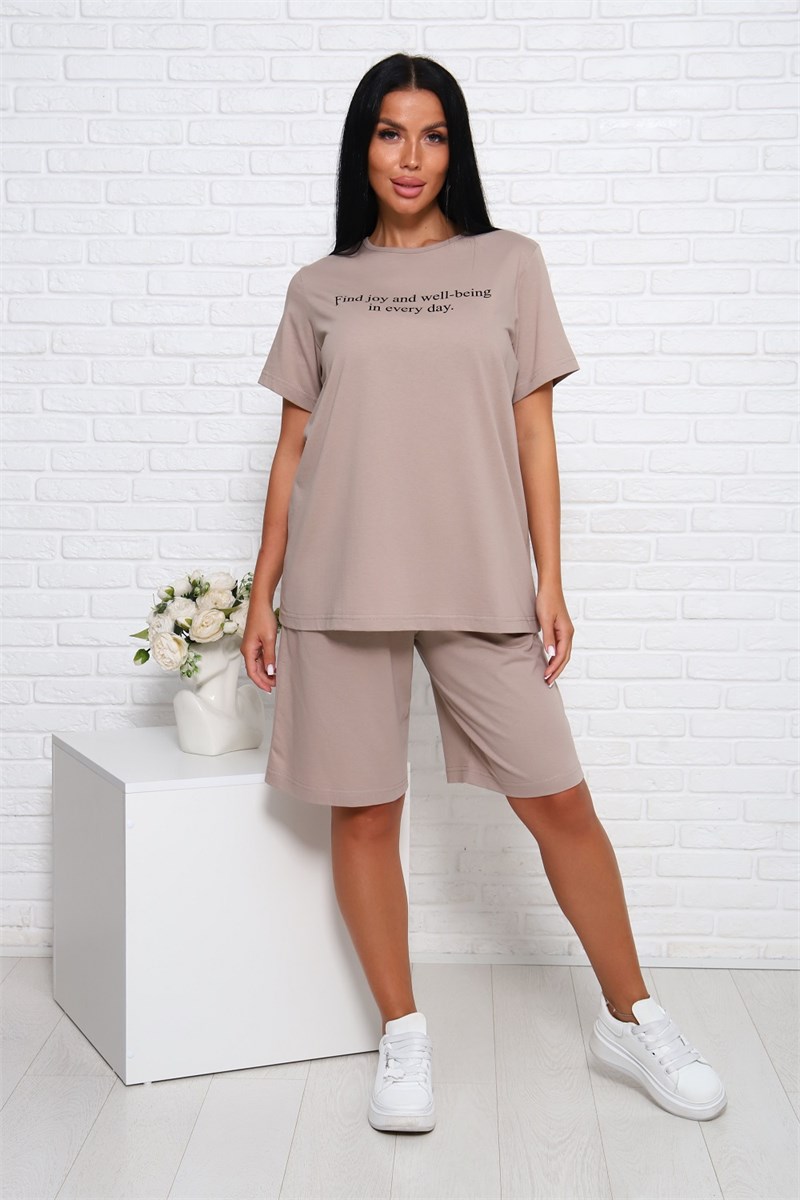 Костюм женский, лаконичный стиль: футболка прямого кроя, с короткими рукавами, с принтом в виде надписи на полочке и шорты на комфортном поясе, с удобными боковыми карманами.