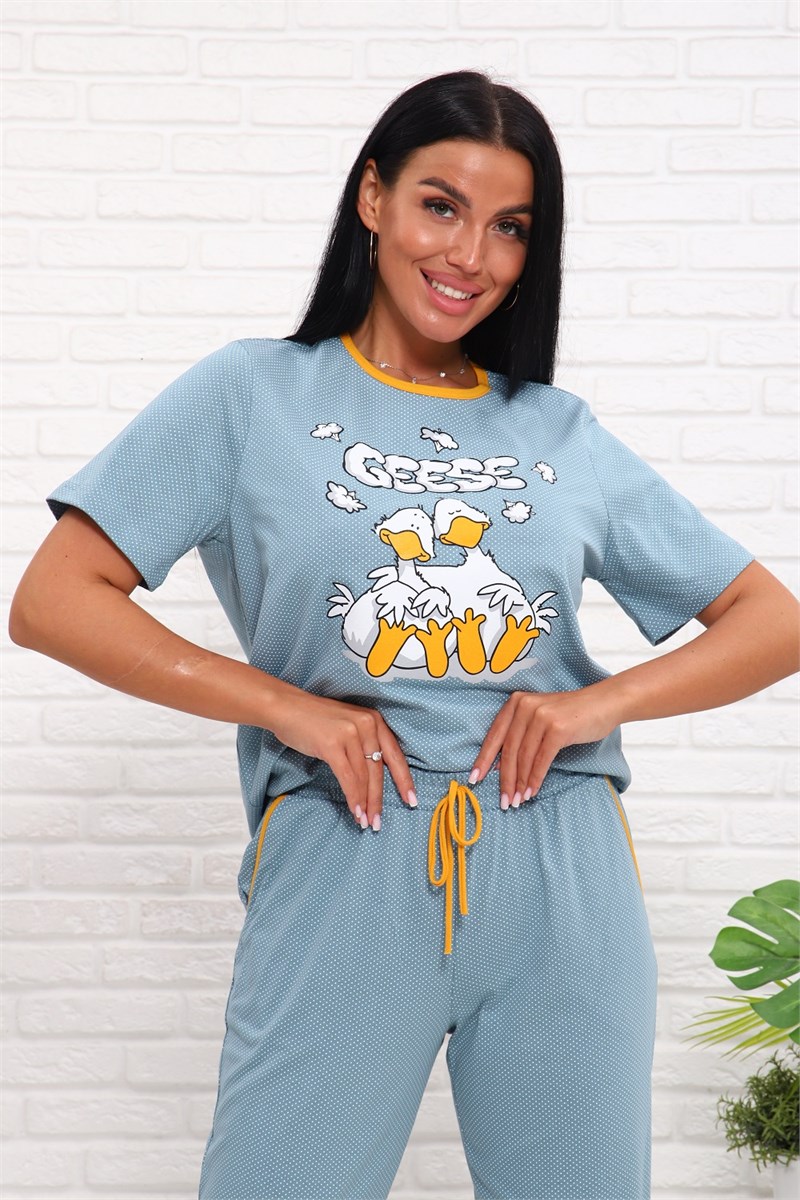 Пижама женская: футболка прямого кроя, с короткими рукавами, с милейшим принтом на полочке, брюки с боковыми карманами (крой Бананы), укороченные, на эластичном поясе декоративный шнурок.