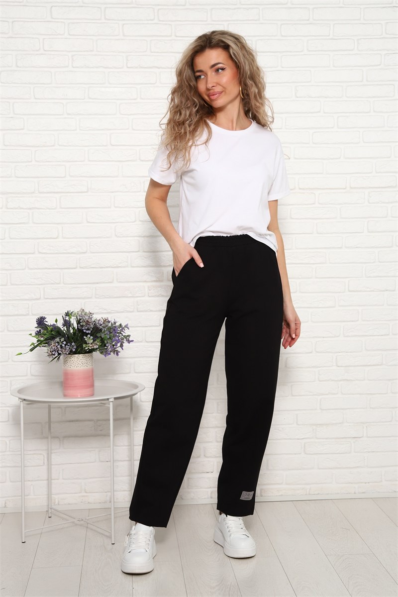 Черные трикотажные брюки силуэта бананы. Трендовая модель из маломнущегося материала. Комфортный эластичный пояс и удобные по глубине карманы.