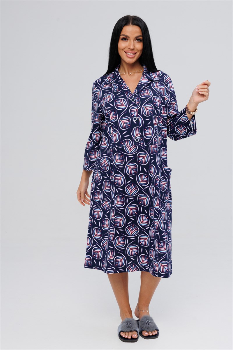 Платье женское из ткани с ярким принтом прямого силуэта, рукав 3/4, выполнено из трикотажного полотна кулика - 100% хлопок. Отрезная кокетка украшена пуговицами и английским воротником. Для практичности дополнено карманами.