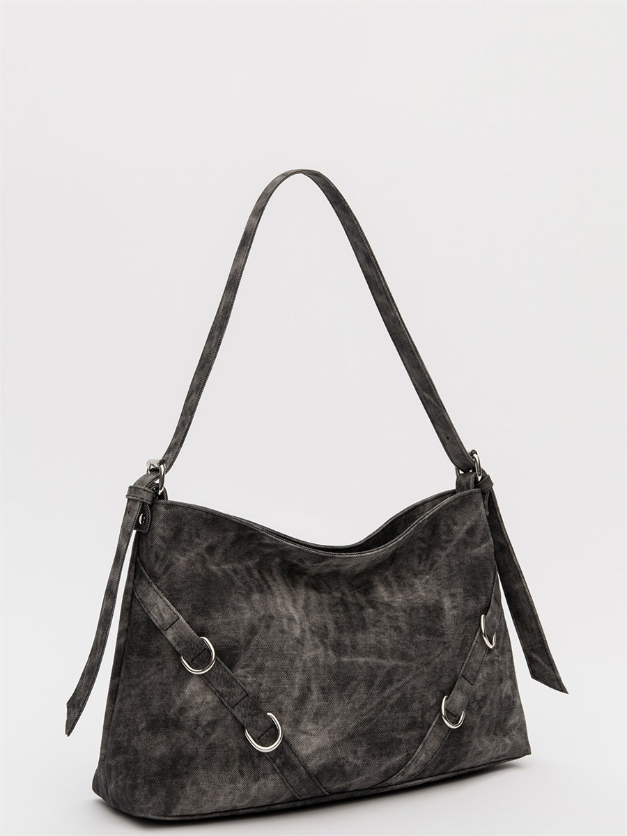 Элегантная форма хобо с декоративными ремнями и металлической фурнитурой представлена в тёмно-сером оттенке. Сочетание винилискожи с отделкой под деним и эффектом тай-дай делает модель стильным акцентом в любом образе.