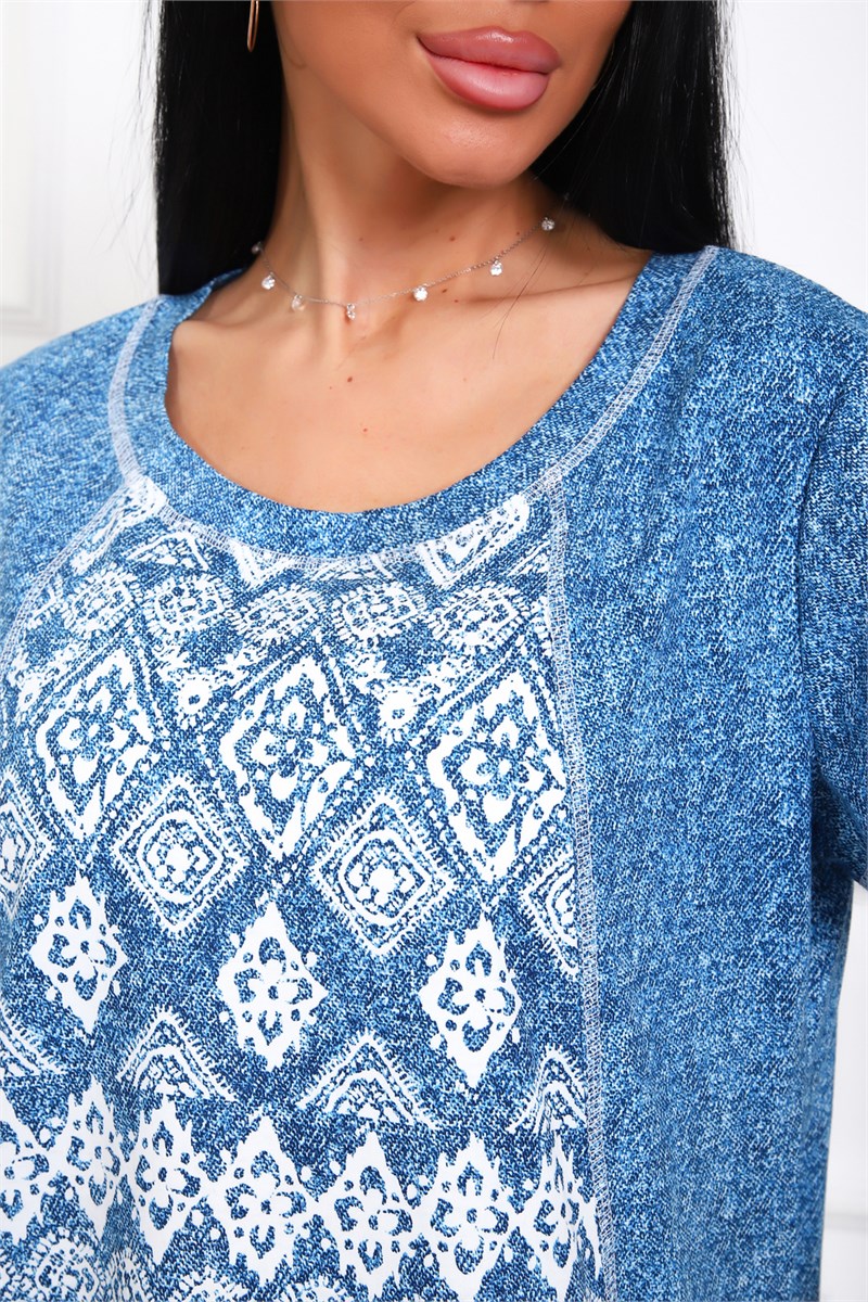 Платье женское из трикотажного полотна. Горловина круглой формы. Линия плеч на естественном месте, рукав короткий. Полочка и спинка резные, с фигурными рельефами и отделочными строчками. На полочке выполнены накладные карманы. По низу изделия притачной пояс. Длина ниже колена.