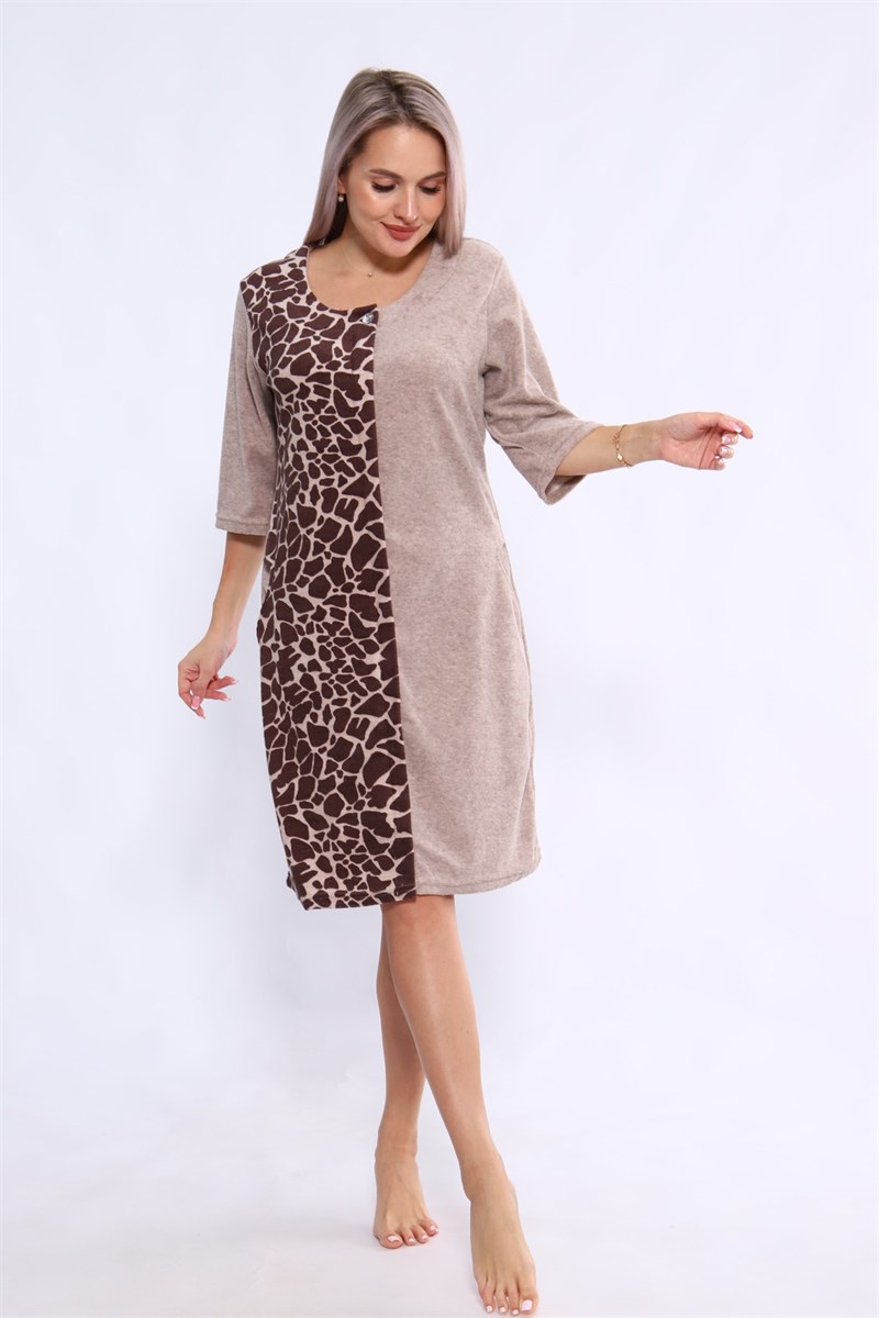 Халат женский махровый на молнии. Халат ткань состав 80% хлопок 20% пэ. Халат на молнии, которая закрывается планкой на пуговицу, рукав 3/4, длина халата средняя.