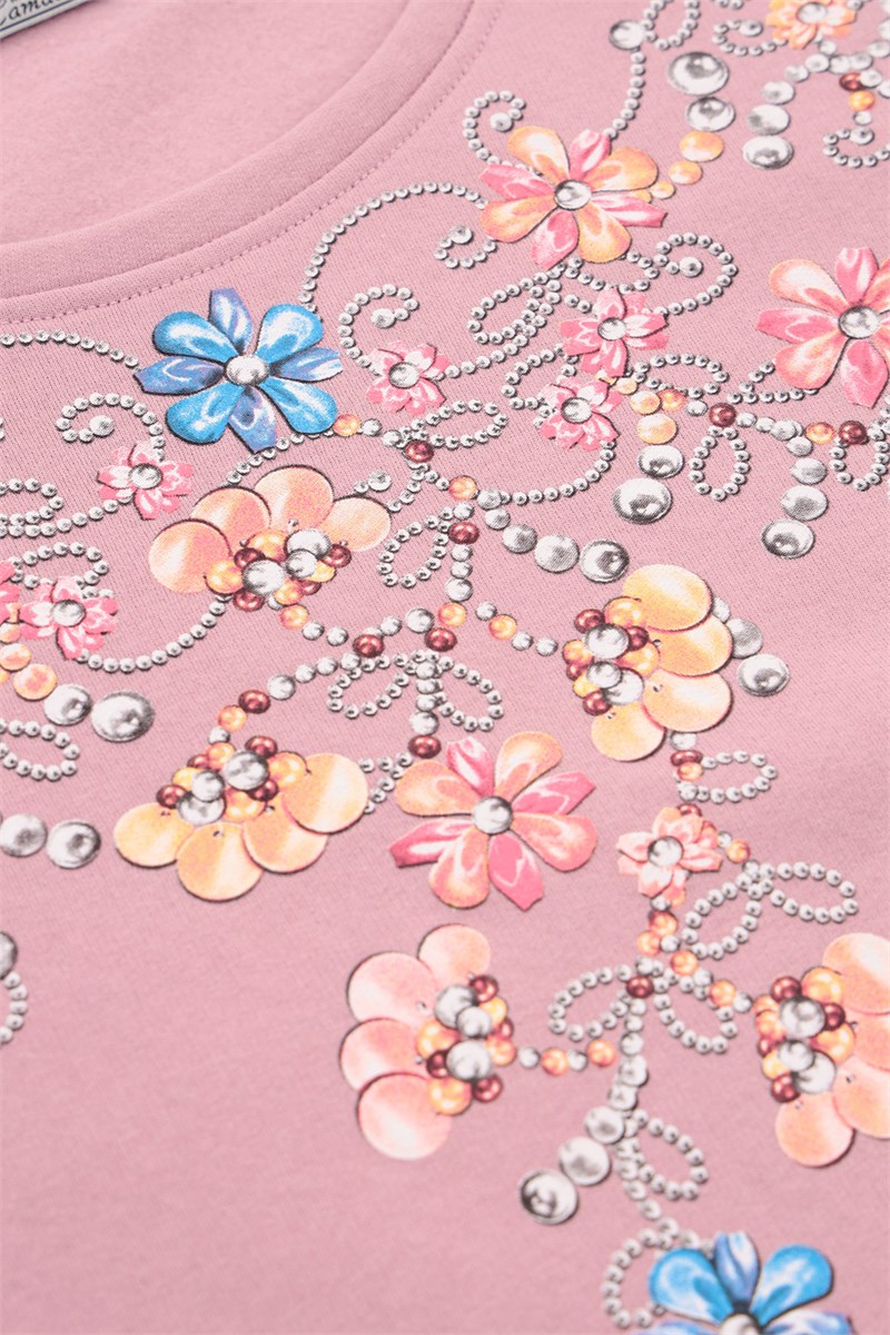 Женская пижама из футера 2-х нитки с начёсом. Дизайн позволяет использовать данную модель как пижаму для сна, так и в качестве костюма для дома. Брюки и лонгслив свободного кроя. Нежный изящный принт в виде россыпи жемчуга и цветов. В измерениях обхвата талии указан размер резинки, которая растягивается без проблем до стандартных измерений фигуры. Очень удобная высокая посадка брюк. Длинные рукава для уюта и тепла.