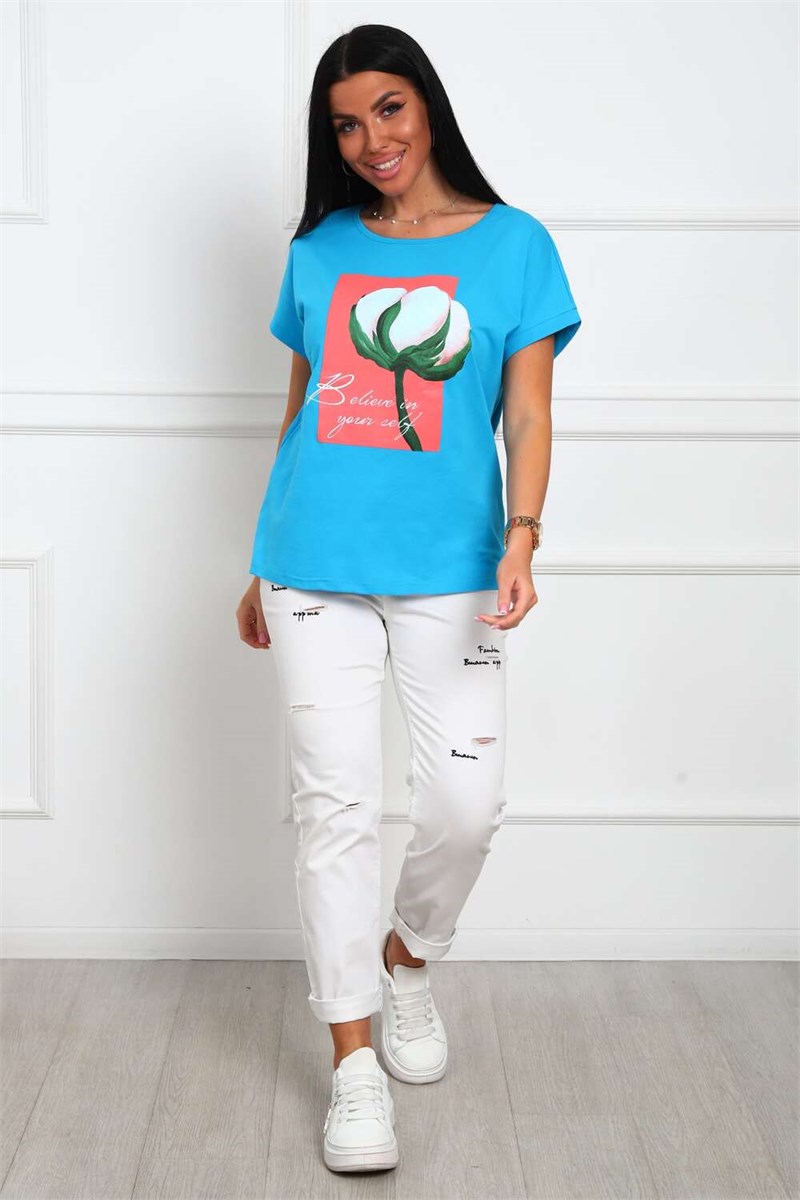 Футболка женская прямого силуэта, из натурального трикотажа - хлопок 100%. Линия плеч спущена, горловина круглой формы . Низ изделия прямой, на полочке располагается большой принт (шелкография).