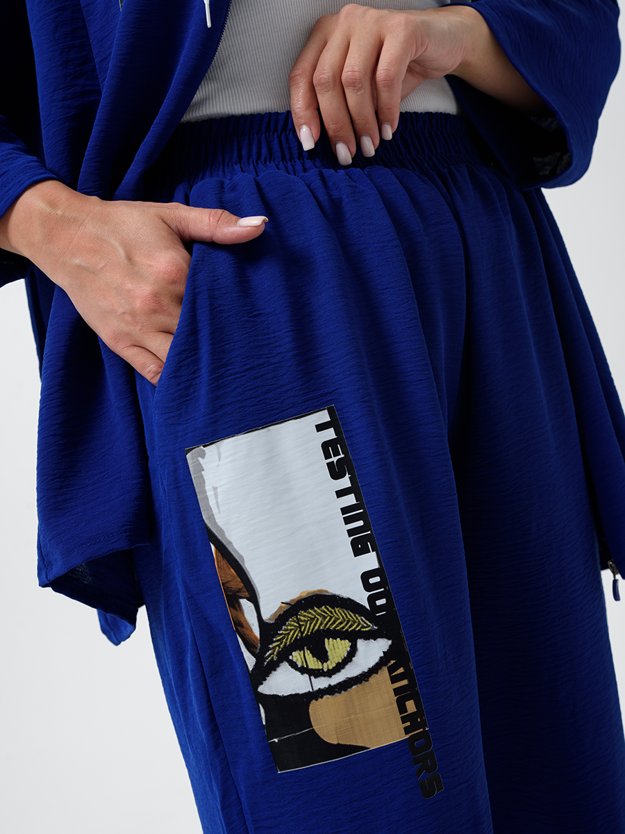 Женский стильный костюм из легкой ткани - сингапур - самое то для жаркого лета. Вверх изделия - удлинненый оверсайз кофточка на молнии с капюшоном, рукава спущенные - длина до запястья (длина рукава указана от горловины). Низ - свободные брюки с карманами, пояс на резинке, снизу имеется защипка, которая слегка заужает штаны. Костюм декорирован принтом. Свободный и стильный, не сковывает движения. Двойка на каждый день в приятных расцветках - хорошая находка для вашего гардероба!
