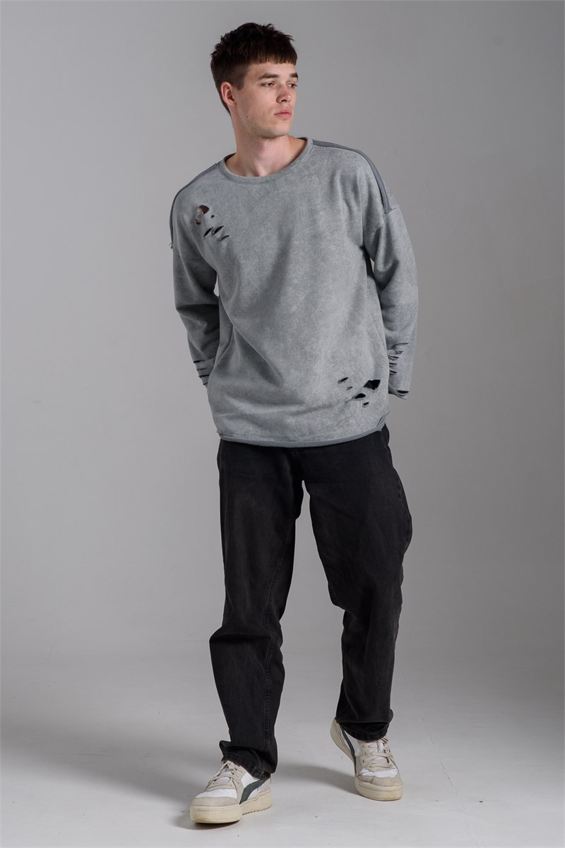 Стильный мужской свитшот в современном дизайне станет отличным дополнением к вашему гардеробу. Изготовлен из мягкого трикотажа, обеспечивает комфорт и тепло прохладными летними вечерами и осенью. Отличается характерной рваной текстурой, что придает ему необычный и оригинальный вид. Легко сочетать с другими элементами одежды. Конструкция рваного свитшота с широкими спущенными плечами и свободным кроем создает расслабленный оверсайз силуэт, что идеально подходит для кэжуал образов. Вырез горловины выполнен в классическом стиле, добавляя простоты и элегантности. Детали дизайна включают в себя необычные прорези, которые подчеркивают гранжевую эстетику. Прекрасно подойдет как для мужчин, так и для женщин, благодаря своему унисекс крою. Также будет уместен в молодежной моде и станет отличным вариантом для создания парных образов.