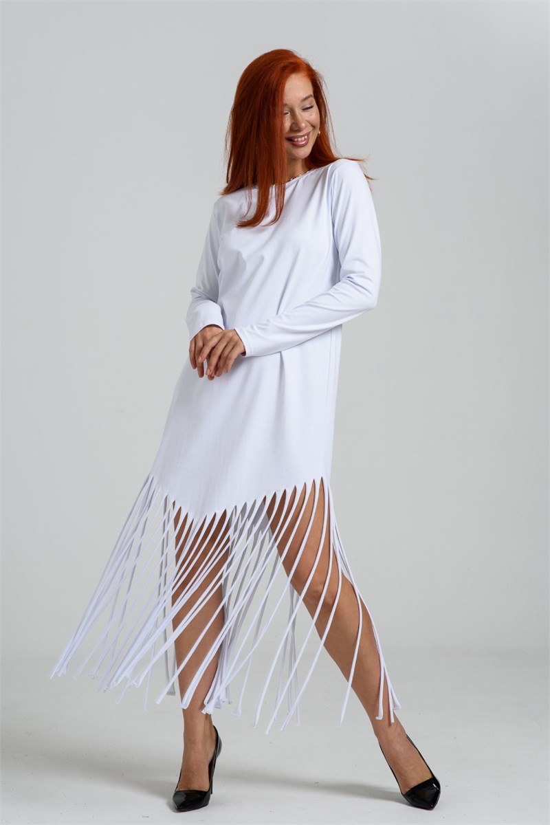 Женское платье прямого кроя с бахромой по низу. Одним из самых популярных элементов летнего гардероба является летнее трикотажное платье. Благодаря легкой ткани и свободному крою обеспечивает комфорт и свободу движений.