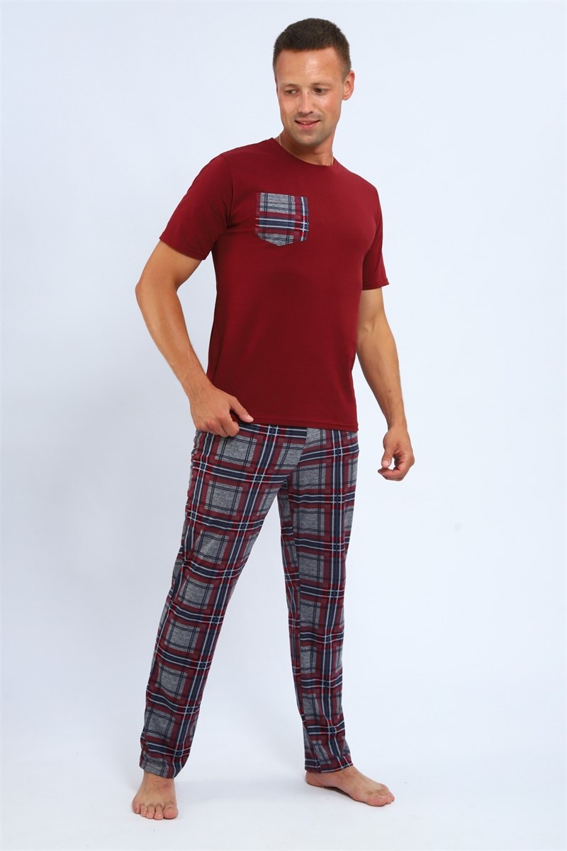 Комплект домашней одежды для мужчины от Руся трикотаж, состоящий из футболки и свободных брюк в клетку.