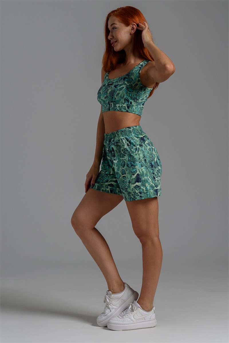 Комплект состоит из топа и шорт. Топ на узких бретелях, с округлой горловиной на полочке и вырезом борцовка сзади. Горловина, проймы и вырез на спинке обработаны бейкой из основного полотна. Шорты на поясе, свободные, с боковыми карманами, с декоративными отворотами по низу. В верхней части передних половинок по шву притачивания пояса расположены складки.