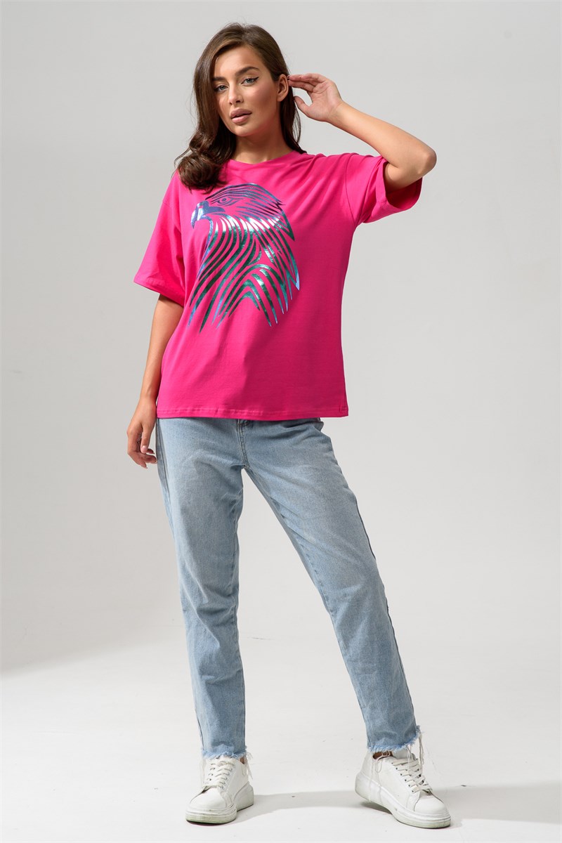 Женская футболка оверсайз это идеальный выбор для девушек, которые любят сочетать комфорт и стиль. Стильная и качественная, она доступна в любом размере, включая большой до 56. Свободный крой подойдет в том числе и для беременных женщин. Высокие стандарты качества делают её универсальным элементом гардероба, подходящим для создания модных повседневных образов. Она идеальна для взрослых и подростков, предпочитающих спортивную и яркая одежду. Высокая плотность ткани 200гр/куб.м. Принт фольга хамелеон или серебро - может попасться без выбора.