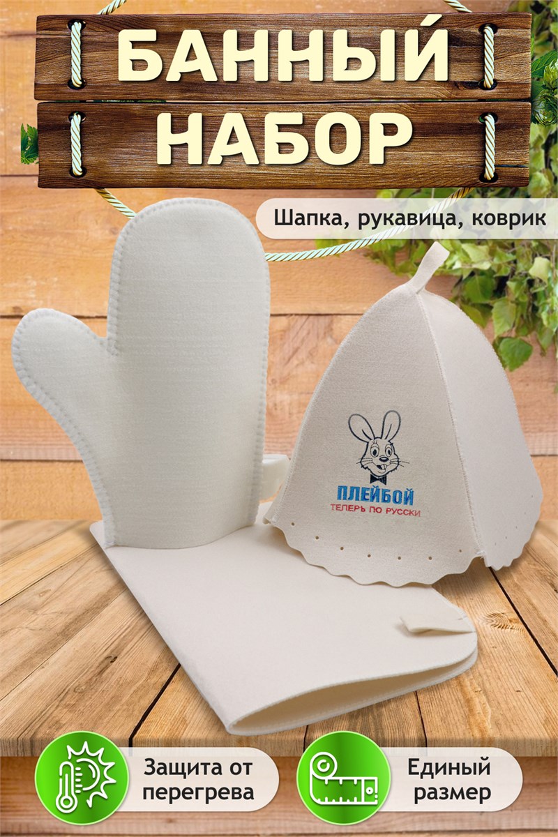 Наш оригинальный набор для бани включает в себя шапку, рукавицу и коврик. Это незаменимые аксессуары для любителей попариться в  бане и сауне. Шапка защитит волосы от сухости и ломкости, голову от перегрева и предотвратит появление головокружения. Рукавицы   это повышение комфорта при использовании банного веника и безопасность ваших рук от появления ожогов. А индивидуальный коврик защитит от высоких температур при контакте с горячей лавкой в парилке. Оригинальная вышивка выполнена качественно и не сотрётся в процессе использования. На изделиях имеются петельки, с помощью которых их можно повесить на крючок в предбаннике. Такой набор станет отличным подарком для любителей отдыха в бане или сауне.
