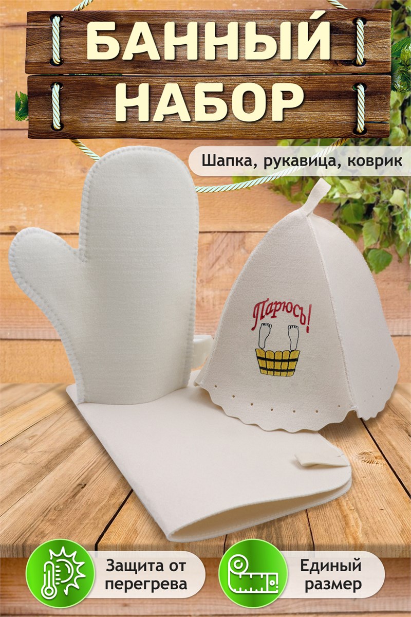 Наш оригинальный набор для бани включает в себя шапку, рукавицу и коврик. Это незаменимые аксессуары для любителей попариться в бане и сауне. Шапка защитит волосы от сухости и ломкости, голову от перегрева и предотвратит появление головокружения. Рукавицы это повышение комфорта при использовании банного веника и безопасность ваших рук от появления ожогов. А индивидуальный коврик защитит от высоких температур при контакте с горячей лавкой в парилке. Оригинальная вышивка выполнена качественно и не сотрётся в процессе использования. На изделиях имеются петельки, с помощью которых их можно повесить на крючок в предбаннике. Такой набор станет отличным подарком для любителей отдыха в бане или сауне.