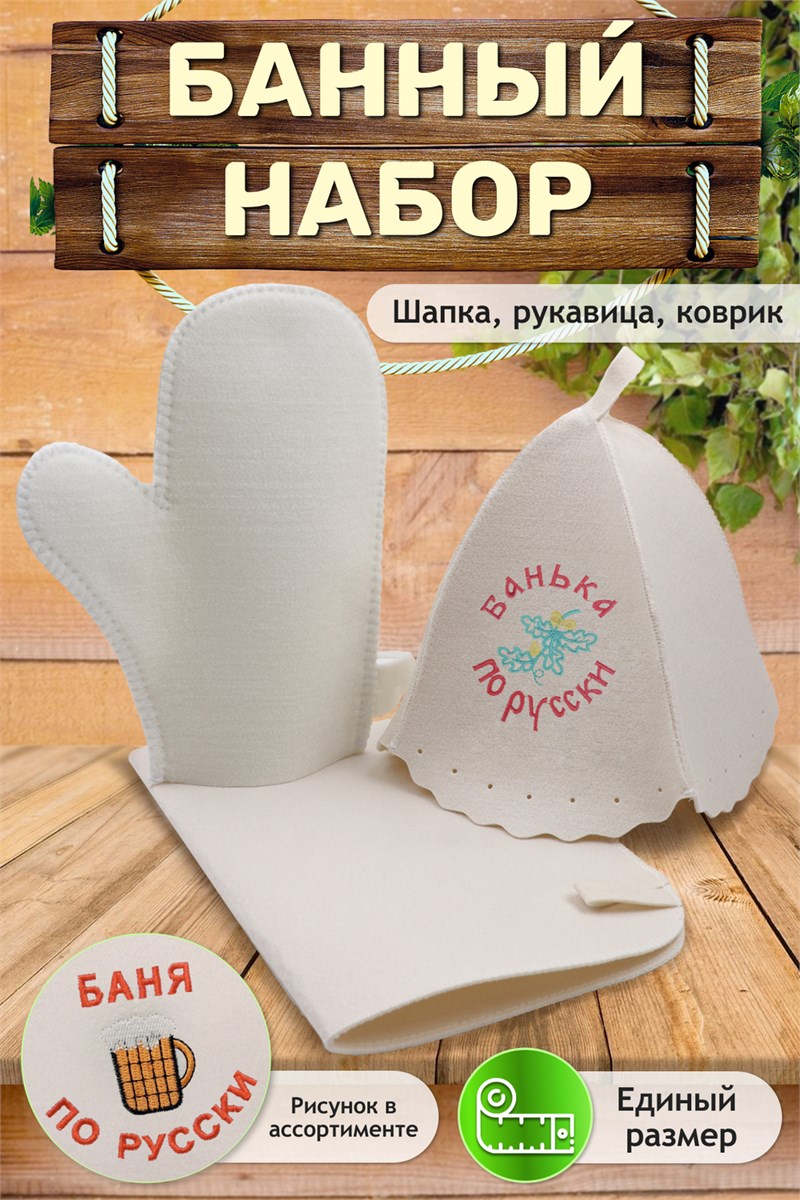 Наш оригинальный набор для бани включает в себя шапку, рукавицу и коврик. Это незаменимые аксессуары для любителей попариться в  бане и сауне. Шапка защитит волосы от сухости и ломкости, голову от перегрева и предотвратит появление головокружения. Рукавицы   это повышение комфорта при использовании банного веника и безопасность ваших рук от появления ожогов. А индивидуальный коврик защитит от высоких температур при контакте с горячей лавкой в парилке. Оригинальная вышивка выполнена качественно и не сотрётся в процессе использования. На изделиях имеются петельки, с помощью которых их можно повесить на крючок в предбаннике. Такой набор станет отличным подарком для любителей отдыха в бане или сауне.
