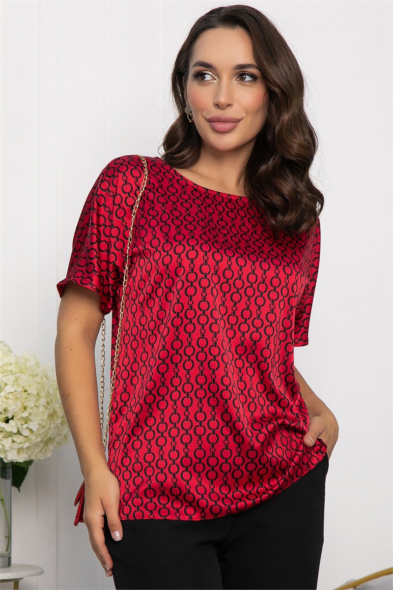 Блуза в красном цвете с принтом станет отличным дополнением в вашем гардеробе! Её легко сочетать с брюками, джинсами или юбкой. Также можно надеть под пиджак или жакет. Модель свободного кроя с цельнокроеным рукавом и округлым вырезом. Она подходит для повседневных образов и для домашнего использования. Благодаря своему свободному крою она обеспечит комфорт и свободу движения. Длина переда короче.