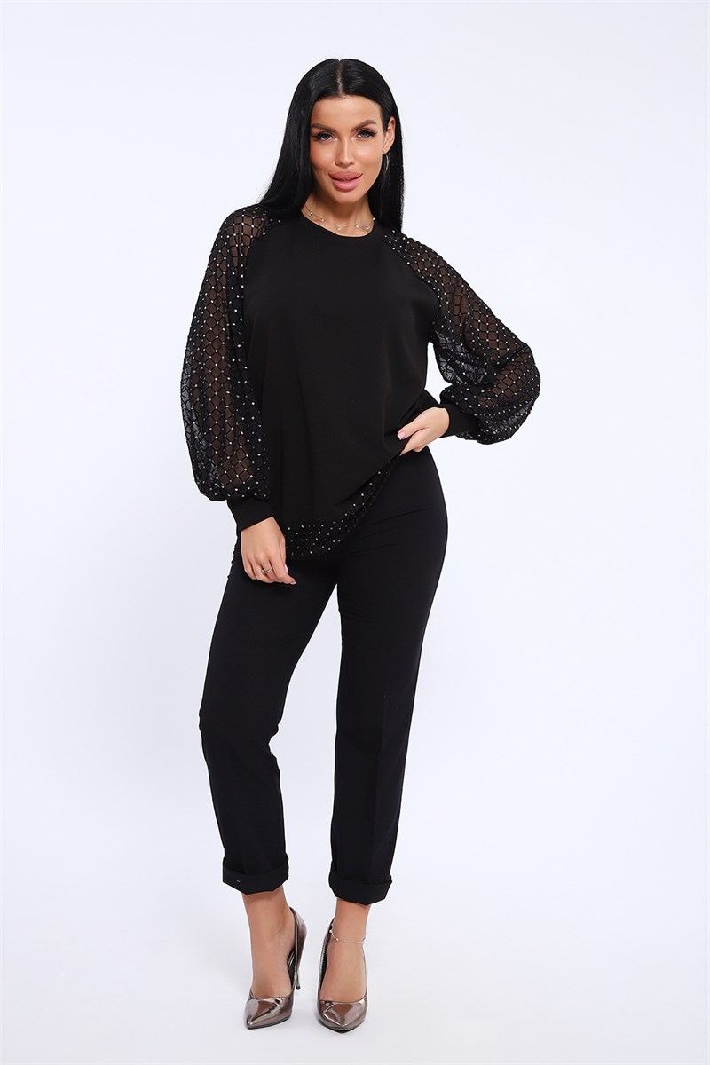 Яркая женская блуза свободного силуэта с объемным рукавом реглан. Рукав и низ переда выполнен из прозрачной эластичной черной сетки с блестками. Основная ткань креп, эластичная, средней плотности не просвечивает. В сочетании с элегантными брюками или юбками, блуза послужит отличным решением для выхода на торжество или праздник. За счет свободного кроя и рукава реглан вы не будете чувствовать скованность и дискомфорт в движении.