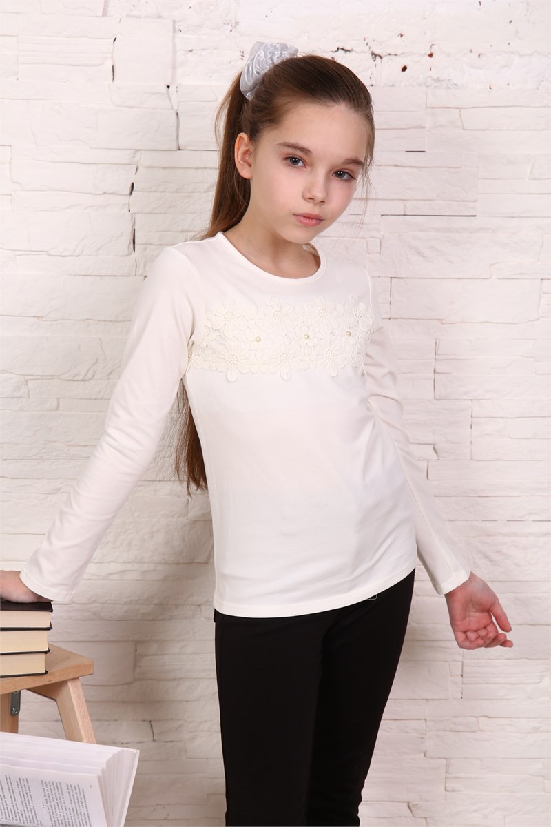 Блузка для девочек дошкольного, младшего и старшего школьного возраста, из однотонного трикотажного полотна кулирка с лайкрой. Блузка прямого силуэта, с втачным рукавом, без застежки. Спереди и на спинке отсутствуют линии членения. На передней части джемпера настрочено кружево по линии груди. Срез горловины обработан узкой окантовочной лентой из того же полотна в 4 сложения. Рукав одношовный, длинный. Низ рукава без манжеты, подогнут. На кружево приклеены 3 полубусины.