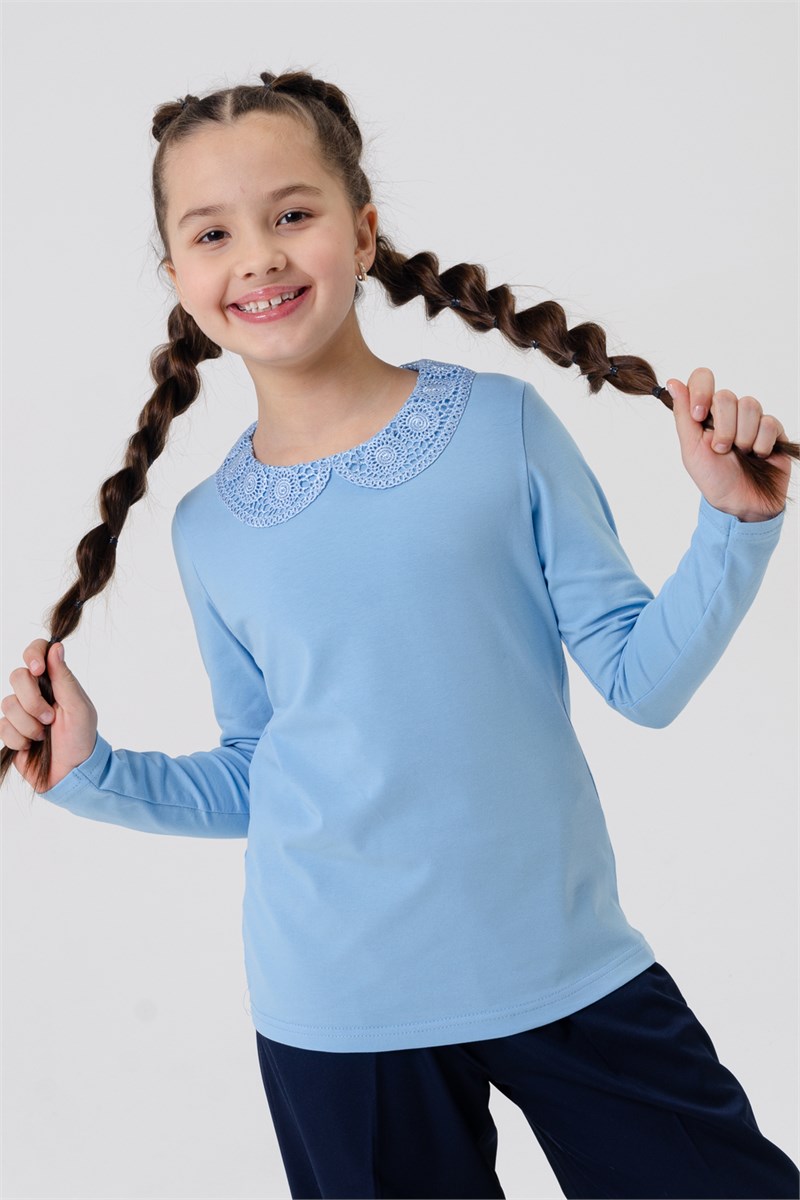 Блузка школьная для девочки с трикотажными длинными рукавами, круглым вырезом горловины, с кружевным воротником, полуприлегающего силуэта, с центральной застежкой на петлю и пуговицу на спинке. Сшита из однотонного мягкого хлопкового трикотажного материала с добавлением в состав хлопка 92% и лайкры 8 %. Школьная форма украсит и дополнит любой образ не только в школу, но и для повседневной носки, на день рождения, фотосессию и для особых случаев. Блузка отлично сидит по фигуре, движения в нем комфортные, позволяет выглядеть ребенку изящно. Хорошо смотрится в сочетании с юбками, сарафанами, брюками, со школьным костюмом, отлично сохраняют цвет и форму при активной носке и после многократных стирок. Используемый материал кофты мягкий и приятный телу, устойчив к износу, не садится, не образует катышек на поверхности, имеет эффектный внешний вид.