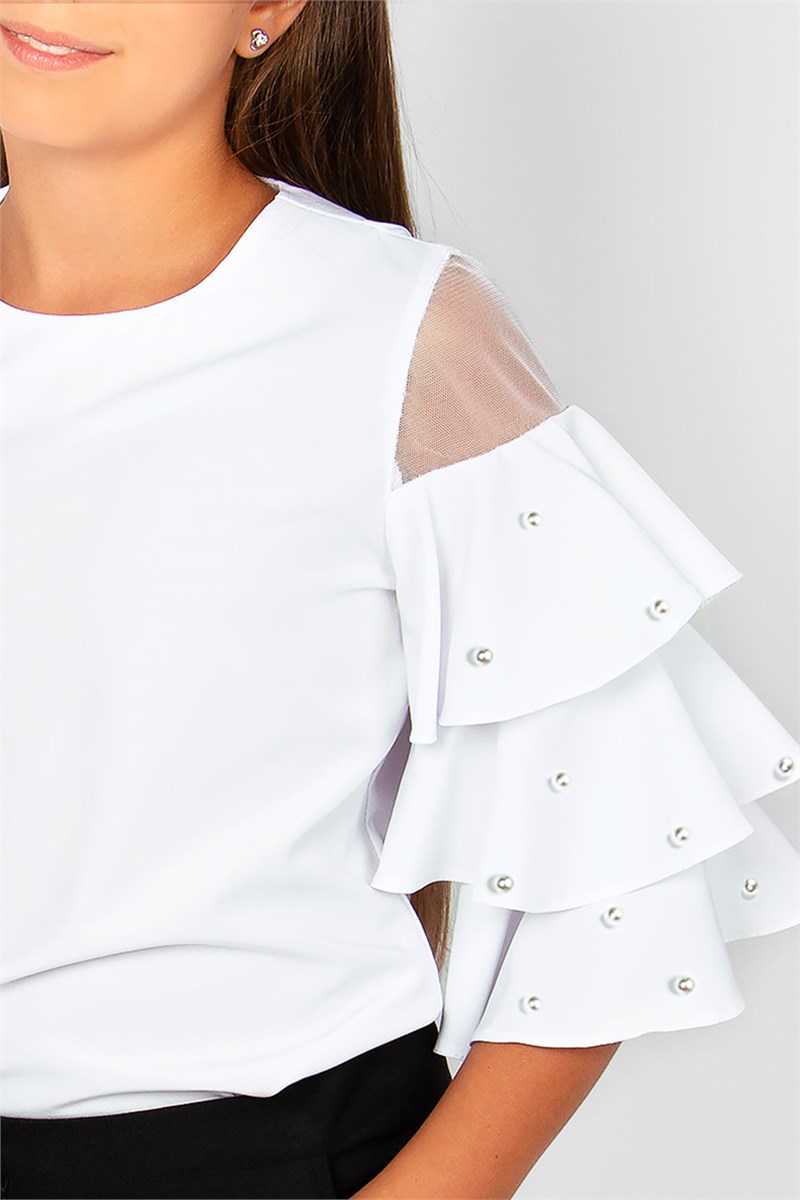 Нарядная школьная блузка свободного силуэта. Рукав 3/4 декорирован пышными воланами с жемчугом.