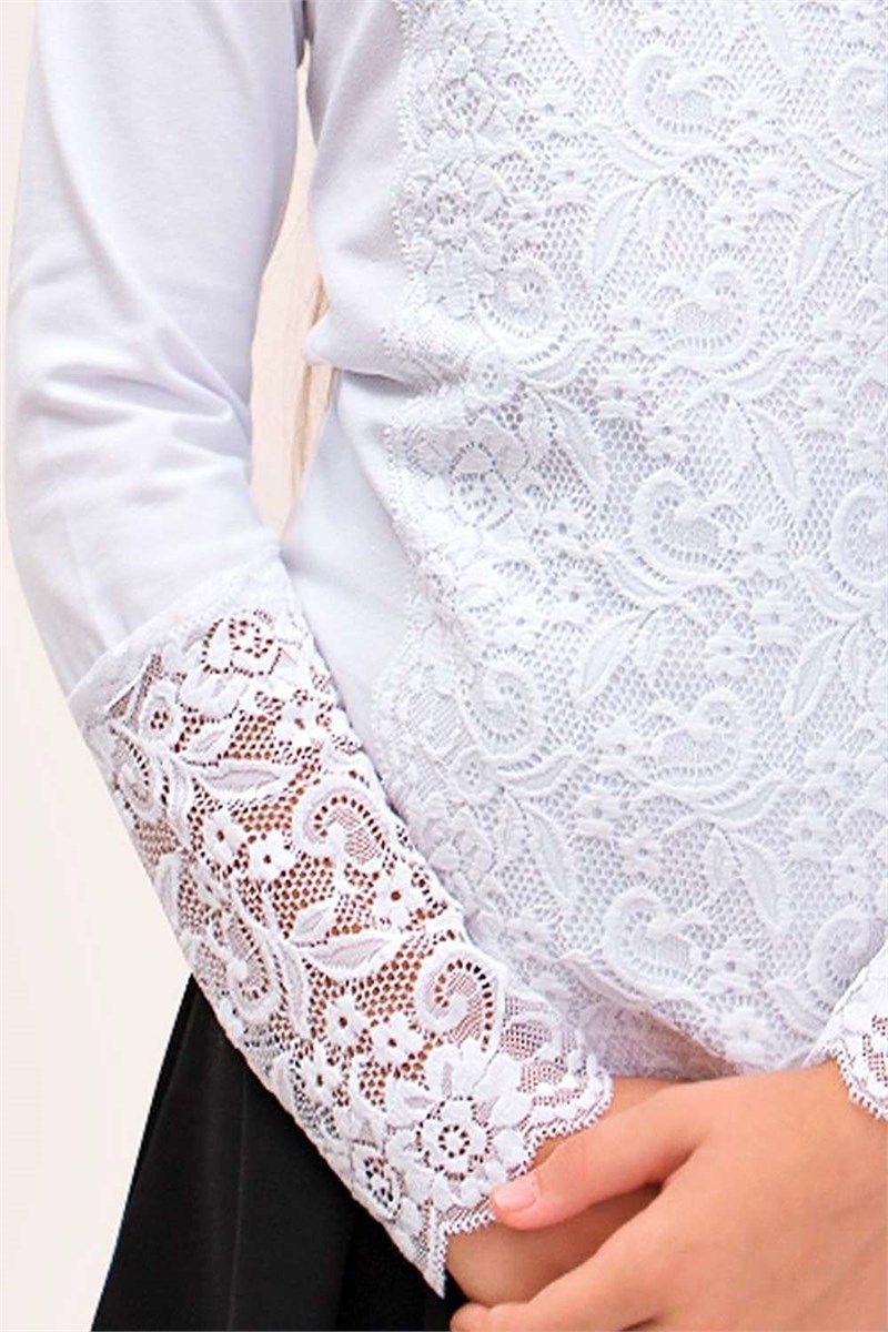 Белый гипюр образует цветочный, набивной узор, горло - стойка.