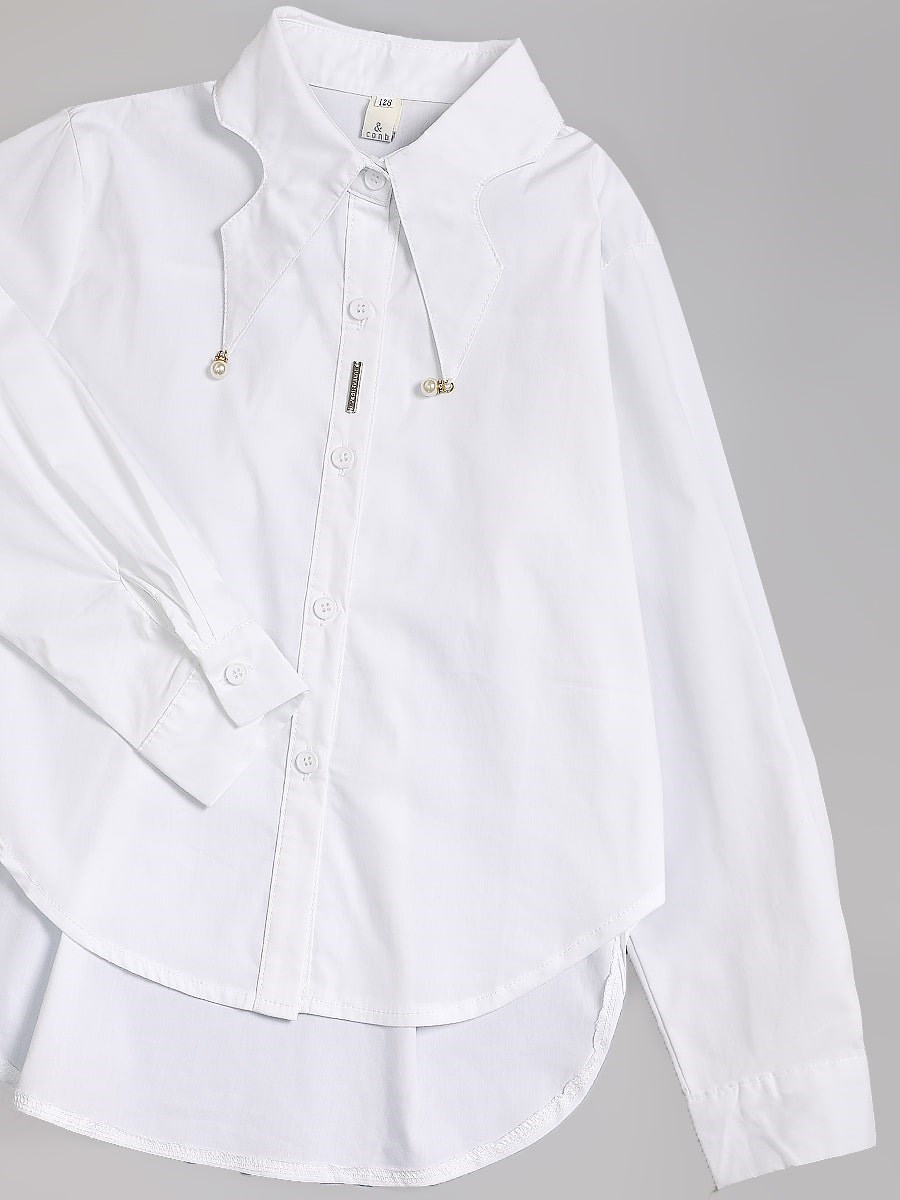Блузка для девочки СольПерец, на пуговицах, с удлинённой спинкой. Отложной, фигурный воротник декоирован бусиной со стразами. Ткань-бенгалин. Эластан, входящий в состав материала, обеспечит идеальную посадку изделия по фигуре. Классический элемент школьной формы прекрасно дополнит гардероб каждой девочки.