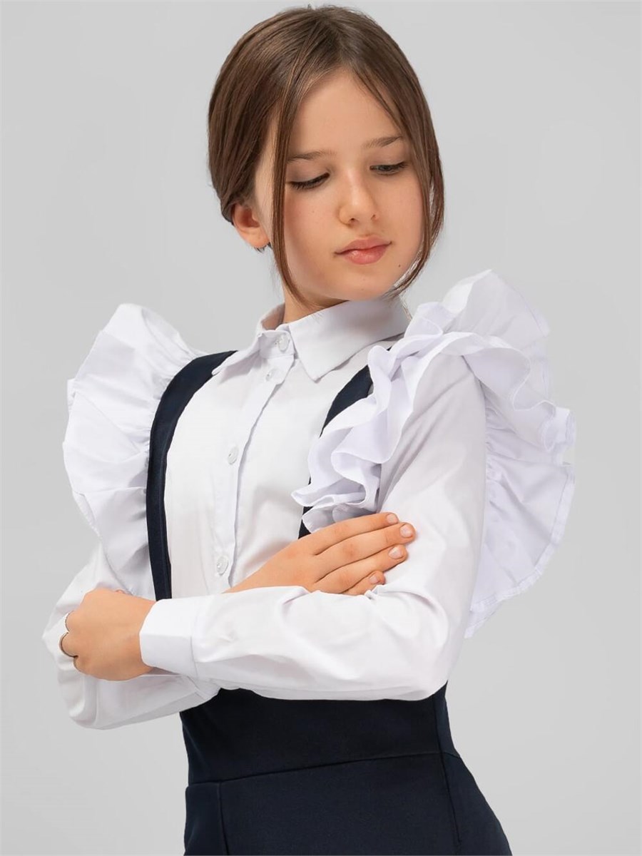 Блузка для девочки СольПерец. Модель с декоративной отделкой, плечи украшены пышными воланами, планка с застежкой на пуговицы. Блузка отлично сочетается с брюками, юбками и сарафанами. Прекрасно подойдет для создания эффектного школьного образа.