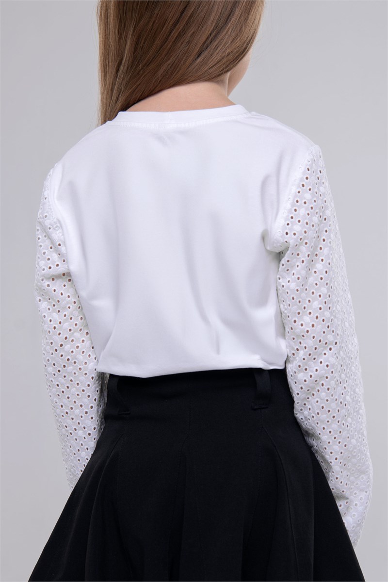 Элегантная белая блузка с ажурными рукавами стильный выбор для школы и особых случаев. Удобная и изящная, она добавит утонченности любому образу.