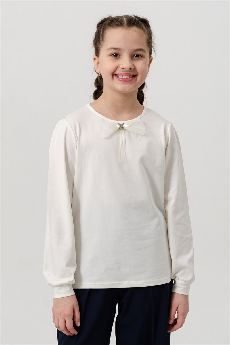 Блузка школьная для девочки с трикотажными длинными рукавами, круглым вырезом горловины, без застёжки, прилегающего силуэта, по центру переда настрочен бант из сетки, спереди прикреплен съёмный декоративный элемент, рукава на манжетах. Сшита из однотонного мягкого хлопкового трикотажного материала с добавлением в состав хлопка 92% и лайкры 8%. Школьная форма украсит и дополнит любой образ не только в школу, но и для повседневной носки, на день рождения, фотосессию и для особых случаев. Блузка отлично сидит по фигуре, движения в нем комфортные, позволяет выглядеть ребенку изящно. Хорошо смотрится в сочетании с юбками, сарафанами, брюками, со школьным костюмом, отлично сохраняют цвет и форму при активной носке и после многократных стирок. Используемый материал блузки мягкий и приятный телу, устойчив к износу, не садится, не образует катышек на поверхности, имеет эффектный внешний вид.