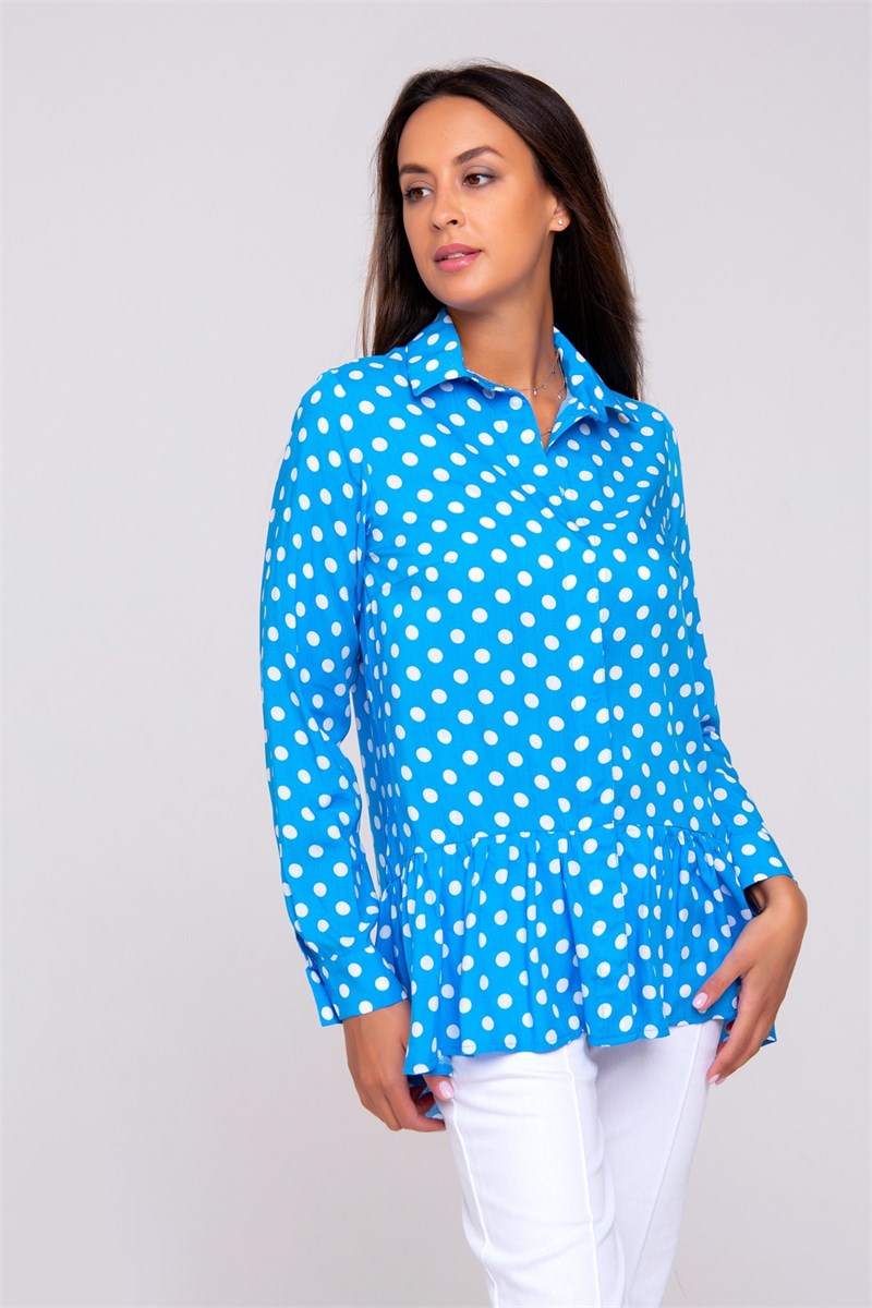Блузка женская нарядная от бренда Raposa - незаменимый базовый предмет Вашего летнего гардероба! Нежнейший принт в горошек, струящаяся ткань, свобода в каждом движении - это все, что нужно жарким летом. Модель блузки с баской, с длинным рукавом придаст женственность вашему летнему наряду. Изысканная штапельная блузка в романтическом стиле легко сочетается с прямой юбкой или брюками. Представлена небольшими размерами с 40 до 48 и прекрасно подойдёт стройным девушкам и девочкам подросткам, для школы, на 1 сентября.