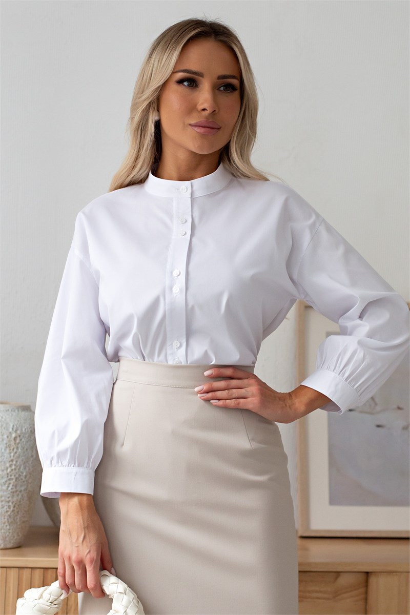 Универсальная рубашка прямого кроя. Втачной рукав длиной 7/8 со спущенным плечом присобран на манжету. Горловина оформлена воротником-стойка. По переду планка с застежкой на петли и пуговицы. Низ ровный ,без разрезов. Рекомендуемая стирка ручная при t не более 30°. Длина изделия: 63 см Длина рукава от горловины : 62 см Рост фотомодели: 168 см Размер фотомодели: 42 Ткань: поплин