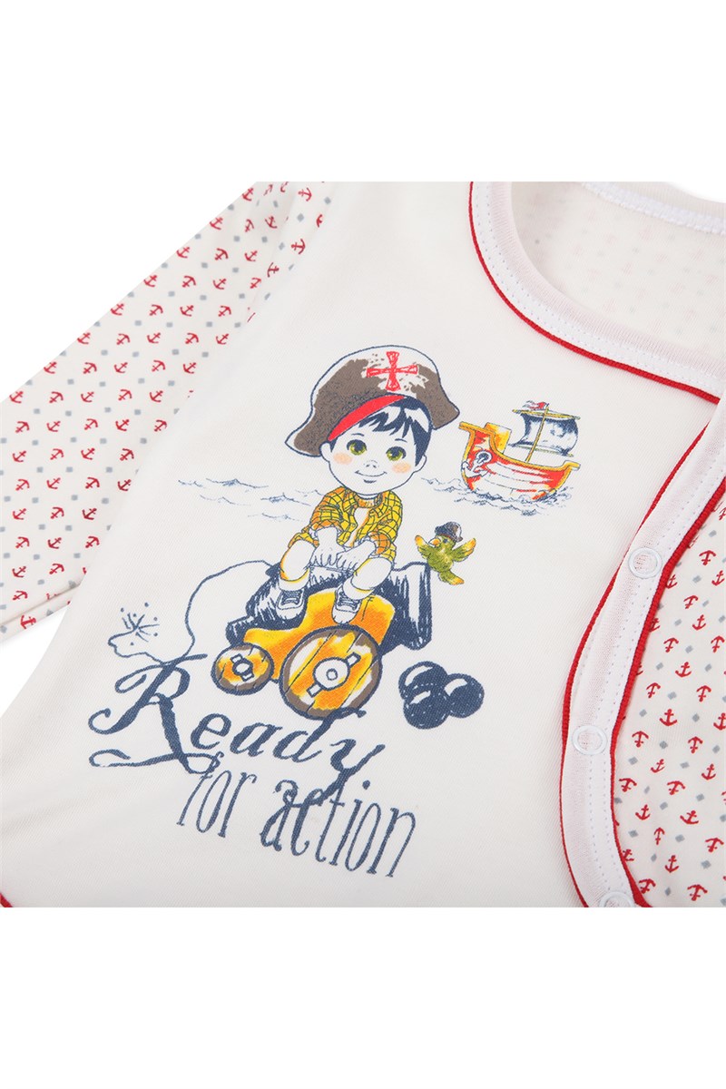 Боди для мальчика. Выполнен из 100% хлопка. Ткань интерлок. Кнопки сбоку изделия и между ножек. Украшен принтом на водной основе.