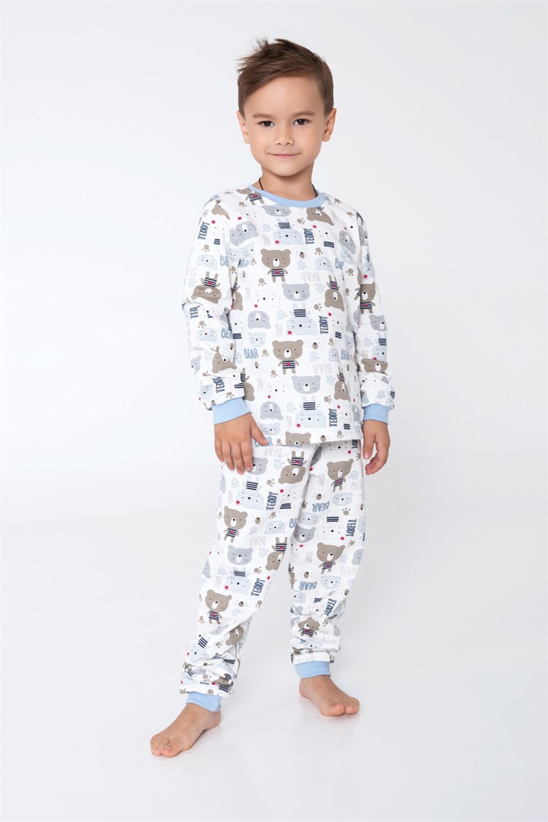 Детская пижама для мальчиков из 100% хлопка в светлых тонах с изображением тематических рисунков.