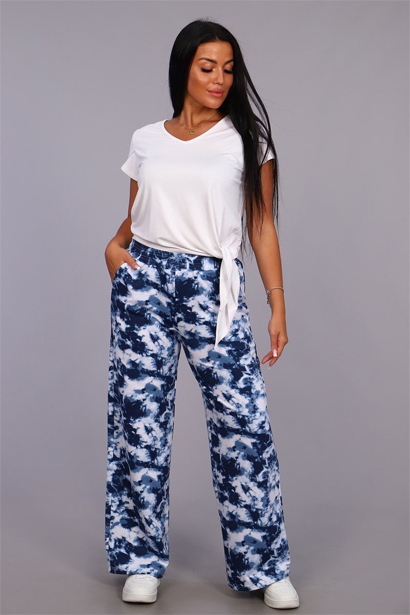 Женские модные брюки-палаццо выполнены из футера в стиле тай-дай. Тай-дай стал настолько большим феноменом, что даже смог проникнуть в уличную и высокую моду, где совершенно не затерялся и получил множество интересных интерпретаций. Высокая удобная посадка, вместительные боковые карманы и качественно обработанный на специальной машине пояс - все это позволит Вам чувствовать себя максимально комфортно. В брюках такого плана Вы будете выглядеть неординарно, модно и стильно.