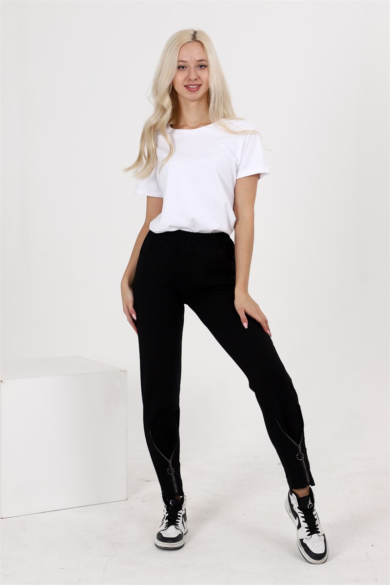 Брюки полуприлегающего силуэта, с боковыми карманами, на эластичном поясе. В нижней части передних половинок обработаны декоративные элементы с молниями.