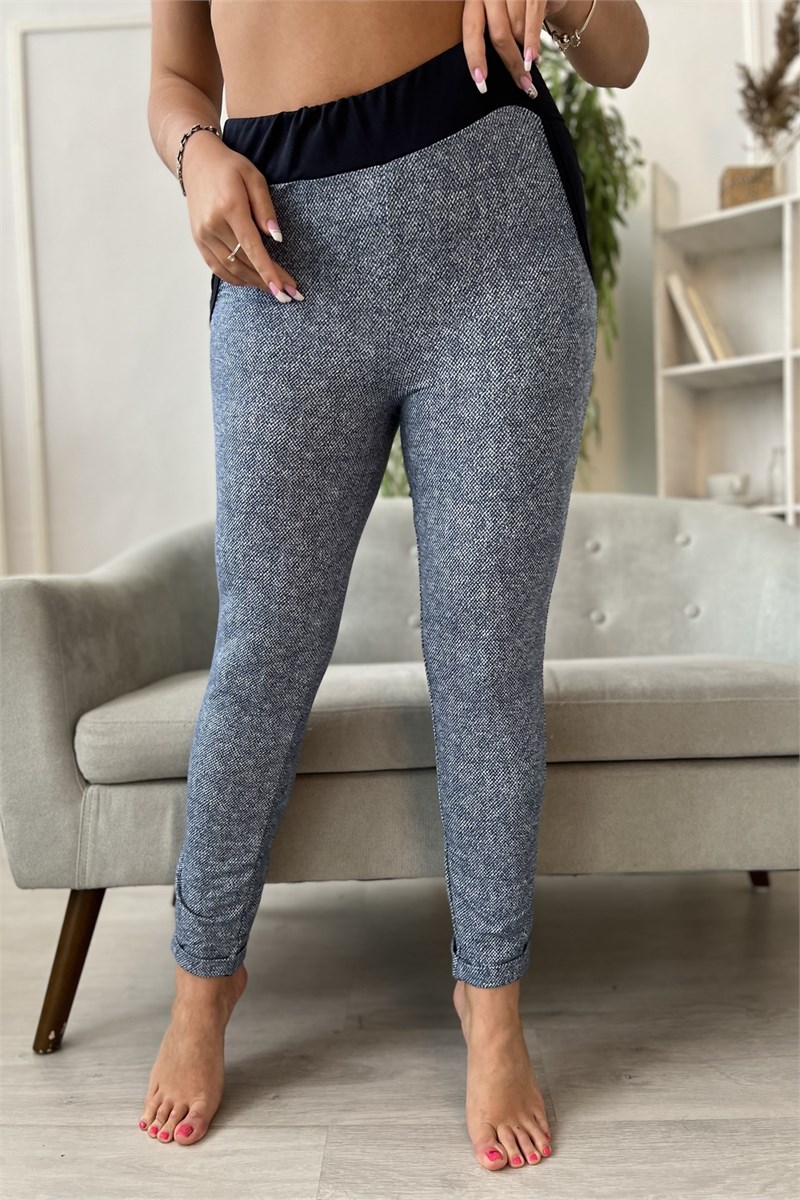 Брюки прилегающие, длина 7/8, внизу цельнокроенная манжета. Пояс, бочки, задние накладные карманы и кокетка из отделочной ткани.