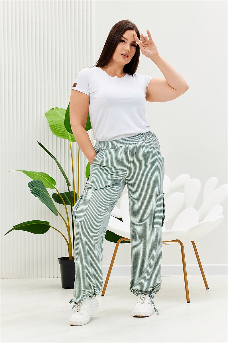 Брюки прямого силуэта, внизу брюк разрезы и утяжки. На передних частях внутренние карманы и боковые с бантовой складкой. Пояс выполнен на многоигольной машине