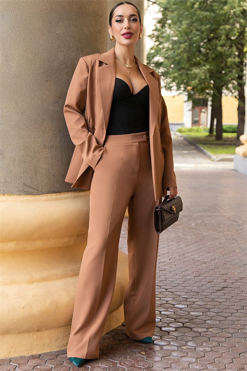 Элегантные классические брюки в оттенке корицы – основа вашего стильного гардероба! Высокая посадка выгодно подчеркивает талию, создавая женственный и утонченный силуэт. Для идеальной посадки по фигуре предусмотрена резинка по спинке пояса. Заутюженные стрелки визуально удлиняют ноги и придают брюкам строгий классический вид. Надежная застежка на молнию и пуговицу обеспечивает комфорт и уверенность в течение дня. Прекрасно вписываются в офисный дресс-код, идеально подходят для важных деловых встреч и добавляют элегантности вашему образу на особых мероприятиях.