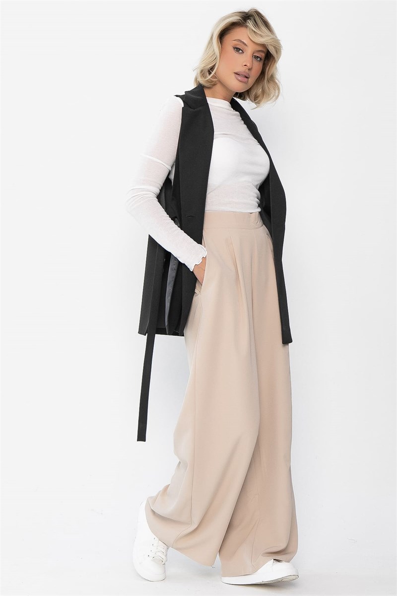 Роскошные брюки палаццо прекрасно подойдут для стильного делового образа. Бежевый цвет позволяет комбинировать их с разнообразным по цвету верхом. Такие брюки отлично подходят на любой случай - на учебу, работу и даже на торжественное мероприятие! Карманы есть в боковых швах. По талии притачной пояс, по спинке резинка.