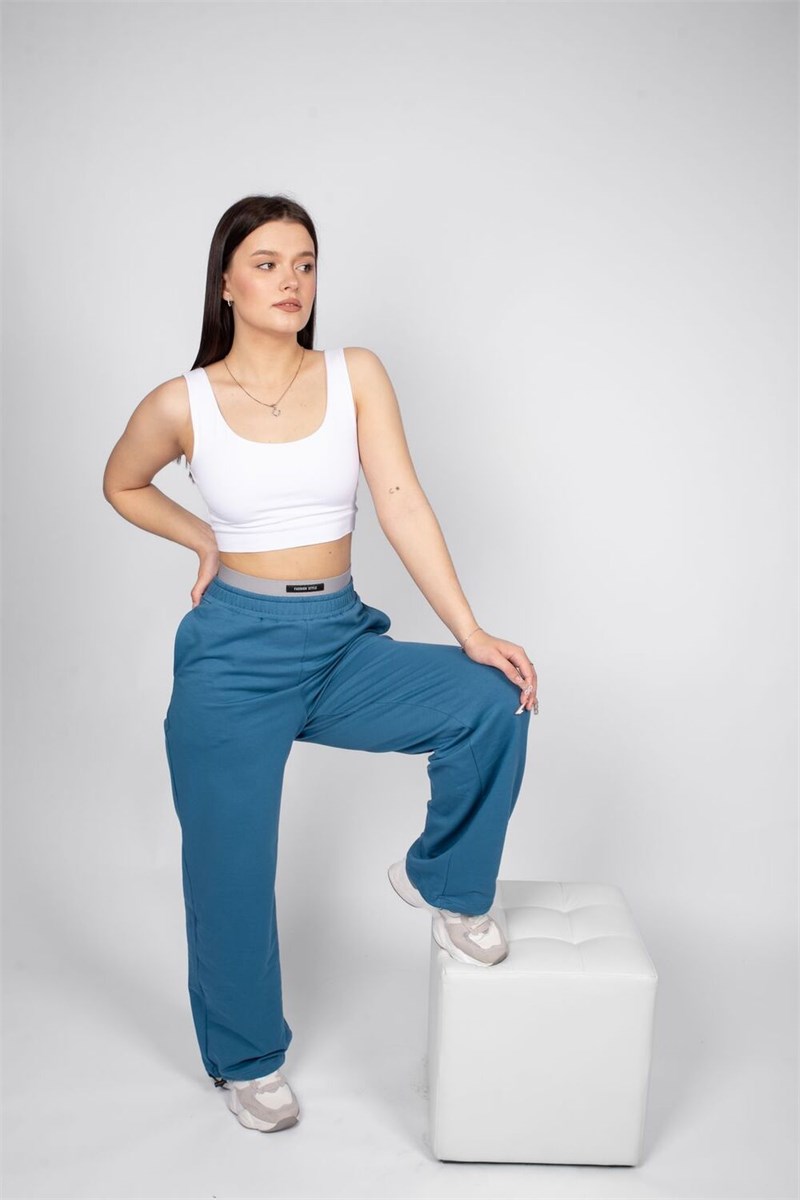 Брюки женские прямого силуэта. Пояс отрезной, выполнен из основного полотна, с эластичной тесьмой внутри. К верхнему срезу поясу притачена резинка, но выглядывает из пояса. На резинке декоративная нашивка. Надпись переводится как Модный стиль. Модель рассчитана на рост 164-170см.