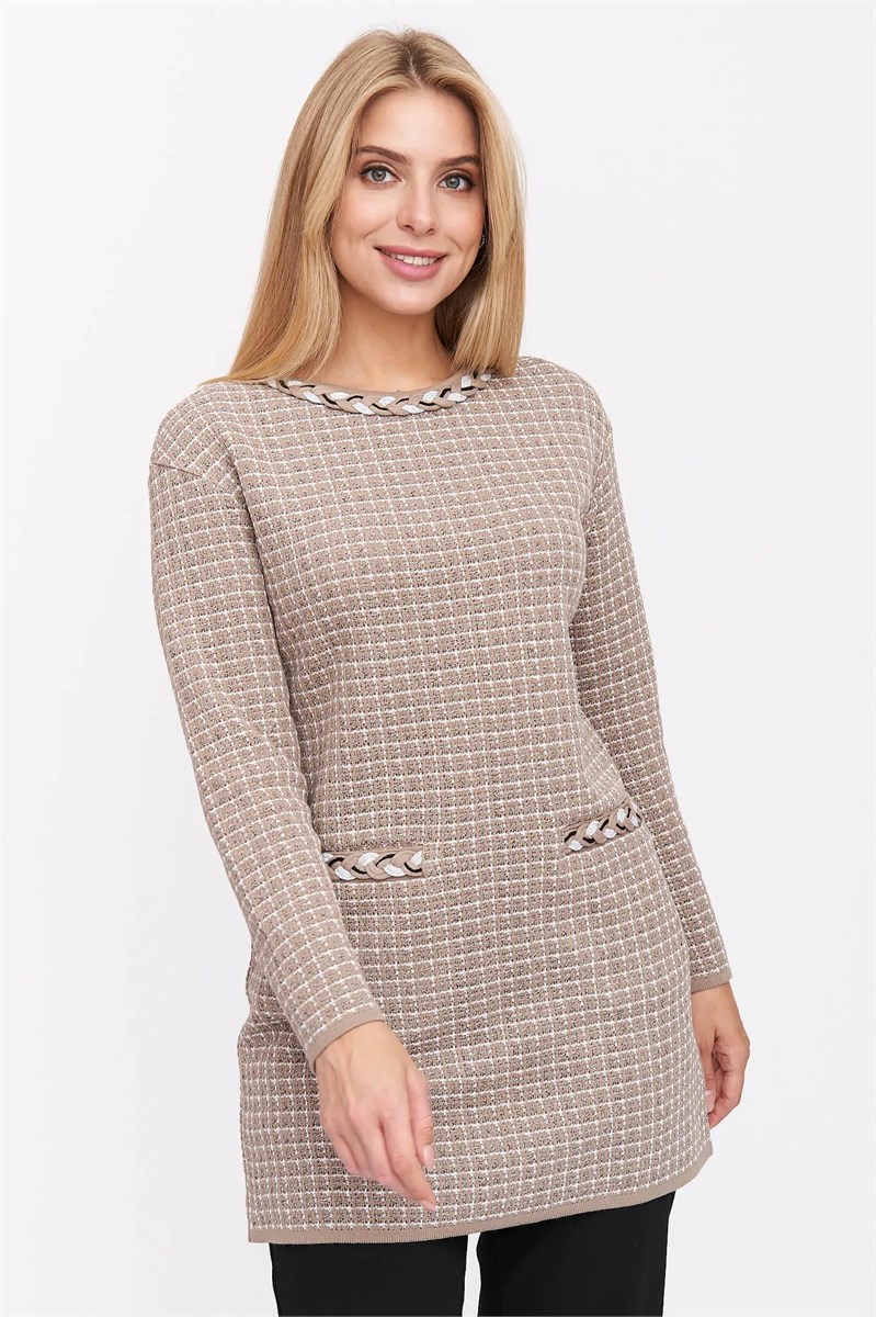 Удлиненый женский вязаный джемпер с круглой горловиной. Рукава втачные длинные. Два прорезных кармана. Джемпер выполнен жаккардовым переплетением образующим мелкую клетку. По горловине и входу в карман декоративные "косички"