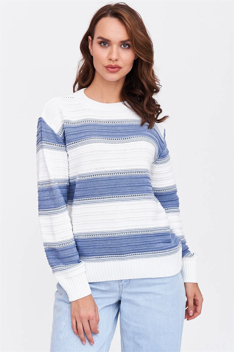 Женский джемпер с круглым вырезом горловины и спущенной линией плеча. Стильная модель выполнена из дышащей, износостойкой, мягкой акриловой пряжи с добавлением полиэстера и шерсти. Поэтому джемпер не только прекрасно смотрится, но и комфортно сидит на любой фигуре, не теряет форму и цвет даже после множества стирок. Отлично сочетается с джинсами, брюками и юбками.