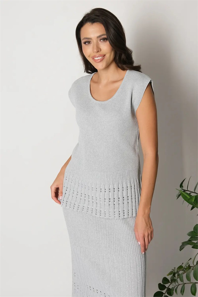 Женский вязаный джемпер полуприлегающего силуэта со спущенным плечом. Джемпер выполнен кулирной гладью, нижняя треть изделия переплетением-лапша с эффектом перфорации. Джемпер можно носить в комплекте с юбкой, вывязанной аналогичным переплетением и узором. Артикул юбок И 014, И 014дл, И 017.