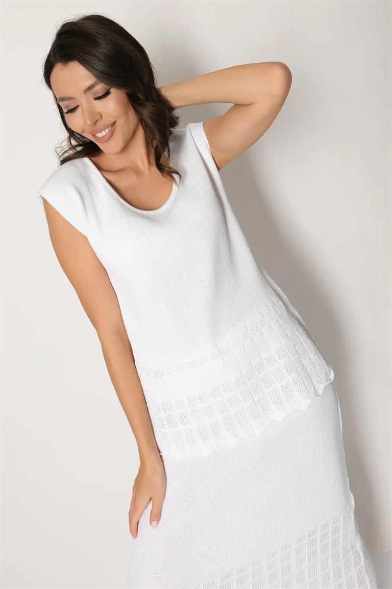 Женский вязаный джемпер полуприлегающего силуэта со спущенным плечом. Ворот круглый. Джемпер выполнен кулирной гладью, нижняя треть изделия-ажурным переплетением с эффектом перфорации. Джемпер можно носить в комплекте с юбкой И 019, выполненной аналогичным переплетением и узором.