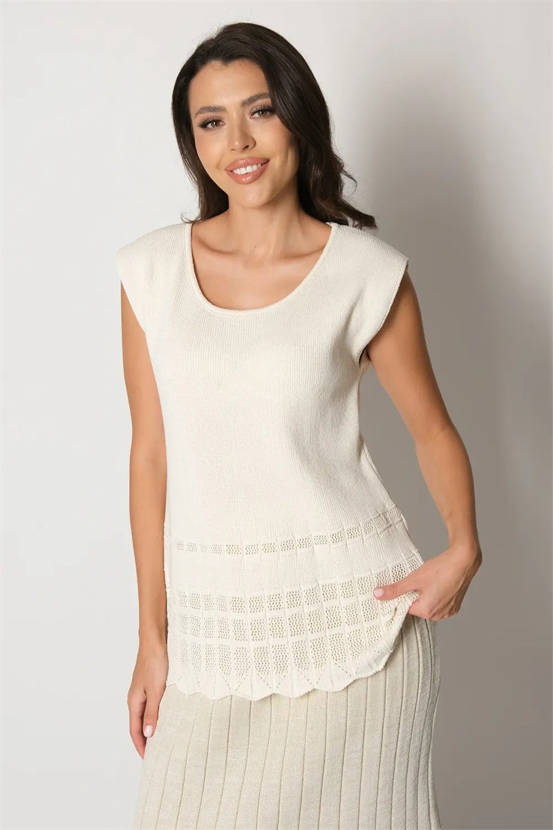Женский вязаный джемпер полуприлегающего силуэта со спущенным плечом. Ворот круглый. Джемпер выполнен кулирной гладью, нижняя треть изделия-ажурным переплетением с эффектом перфорации. Джемпер можно носить в комплекте с юбкой И 019, выполненной аналогичным переплетением и узором.