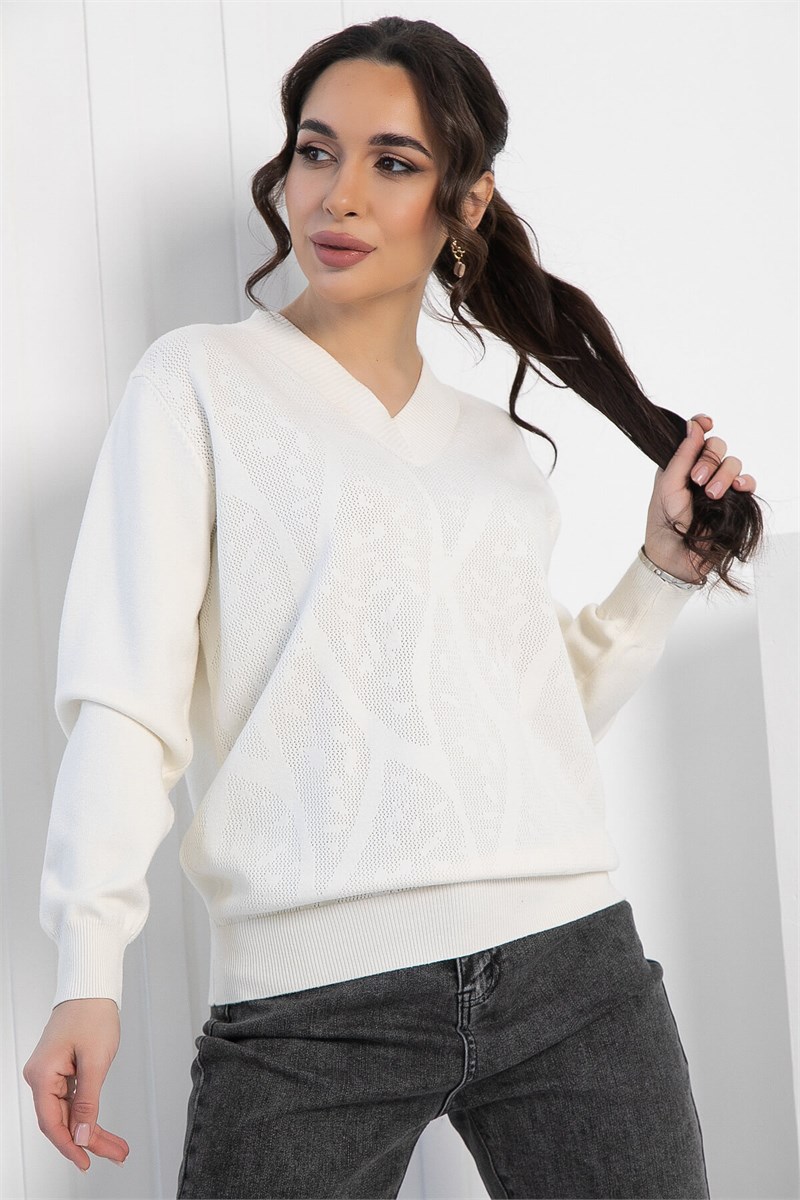 Женский джемпер в оттенке айвори, с декоративной вязкой на передней части изделия. Горловина украшена V-образным вырезом, а рукава втачные. Эта модель прекрасно дополнит любой гардероб и станет его основой для осенне-зимнего сезона. Носите джемпер как самостоятельный предмет одежды или как второй слой поверх топов и рубашек.