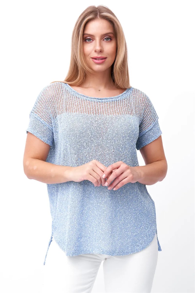Джемпер с цельновывязанным рукавом "летучая мышь". Горловина круглая. Джемпер выполнен структурным кулирным переплетением. Кокетка выполнена ажурным переплетением "сетка".