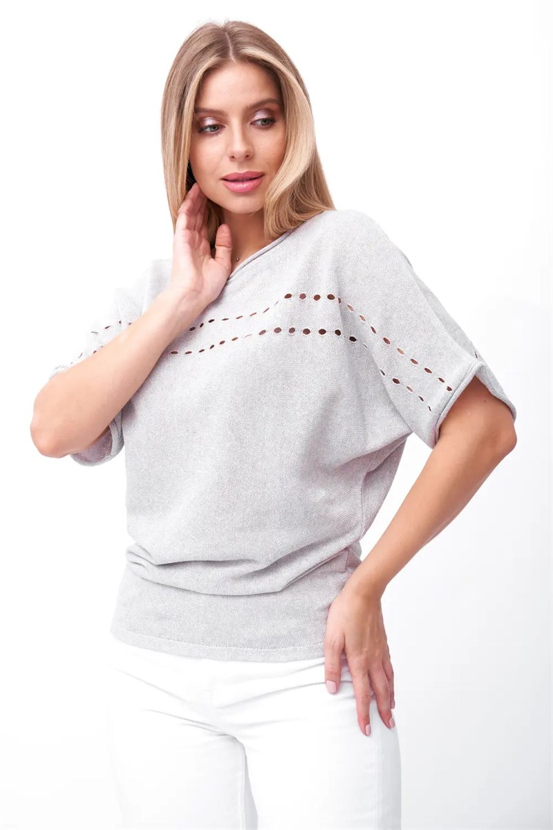 Джемпер с цельновывязанным рукавом "летучая мышь"длиной до локтевого сгиба. Горловина круглая лодочка. Джемпер выполнен структурным кулирным переплетением. По линии выше груди проходит ажур.