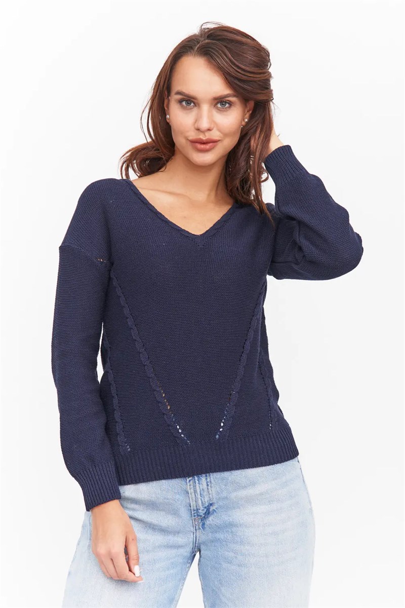 Женский трикотажный джемпер с длинным рукавом, V-образный вырез горловины, плечо спущенное, рукава втачные.