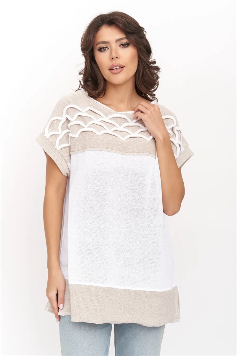 Ажурный женский трикотажный джемпер свободного силуэта. Плечо спущенное без рукавов, вырез горловины круглый. Джемпер выполнен ажурным переплетением, горловина, низ изделия и проймы рукавов обработаны эластичным переплетением.